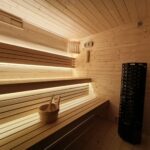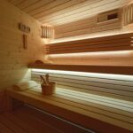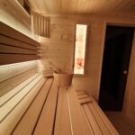 - ławki na dwóch poziomach z tzw. „zimnego drewna” abachi, można bezpiecznie usiąść bądź oprzeć się w saunie