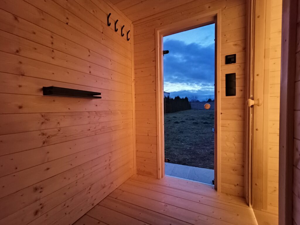 - ściany o grubości 150 mm, starannie zaizolowane wełną skalną gr. 70mm (zmniejsza to straty energii w saunie, pozwalając oszczędzać czas i pieniądze na ogrzewaniu)