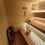 - ławki na dwóch poziomach z tzw. „zimnego drewna” abachi, można bezpiecznie usiąść bądź oprzeć się w saunie