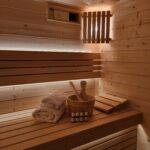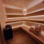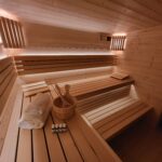 - ławki na dwóch poziomach z tzw. „zimnego drewna” abachi, można bezpiecznie usiąść bądź oprzeć się w saunie