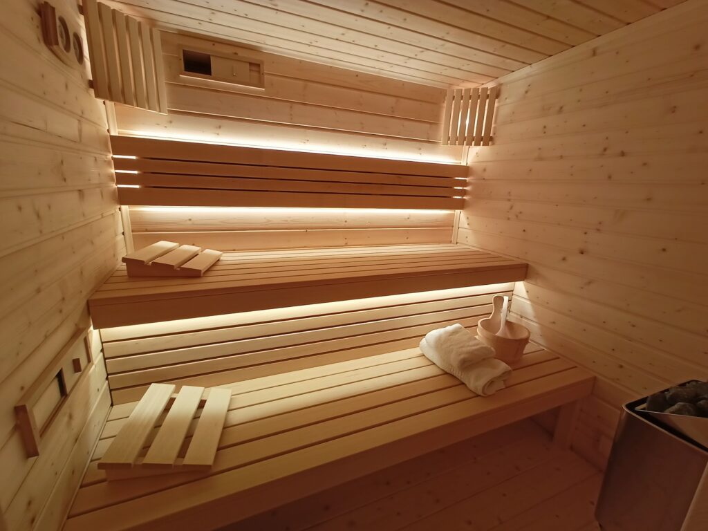 • wykończenie z drewna o znikomej zawartości żywicy (świerk skandynawski), do zastosowania w tradycyjnych saunach fińskich