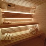 • ławki na dwóch poziomach z tzw. „zimnego drewna” abachi, można bezpiecznie usiąść bądź oprzeć się w saunie