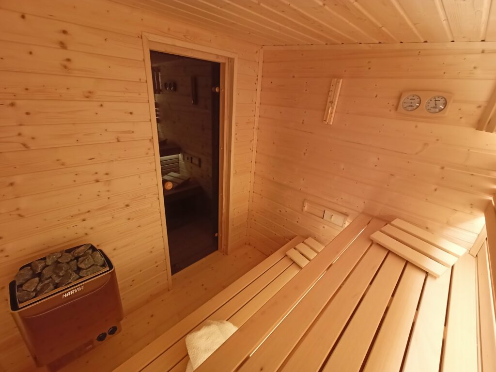 • ściany o grubości 150 mm, starannie zaizolowane wełną skalną gr. 70mm (zmniejsza to straty energii w saunie, pozwalając oszczędzać czas i pieniądze na ogrzewaniu)